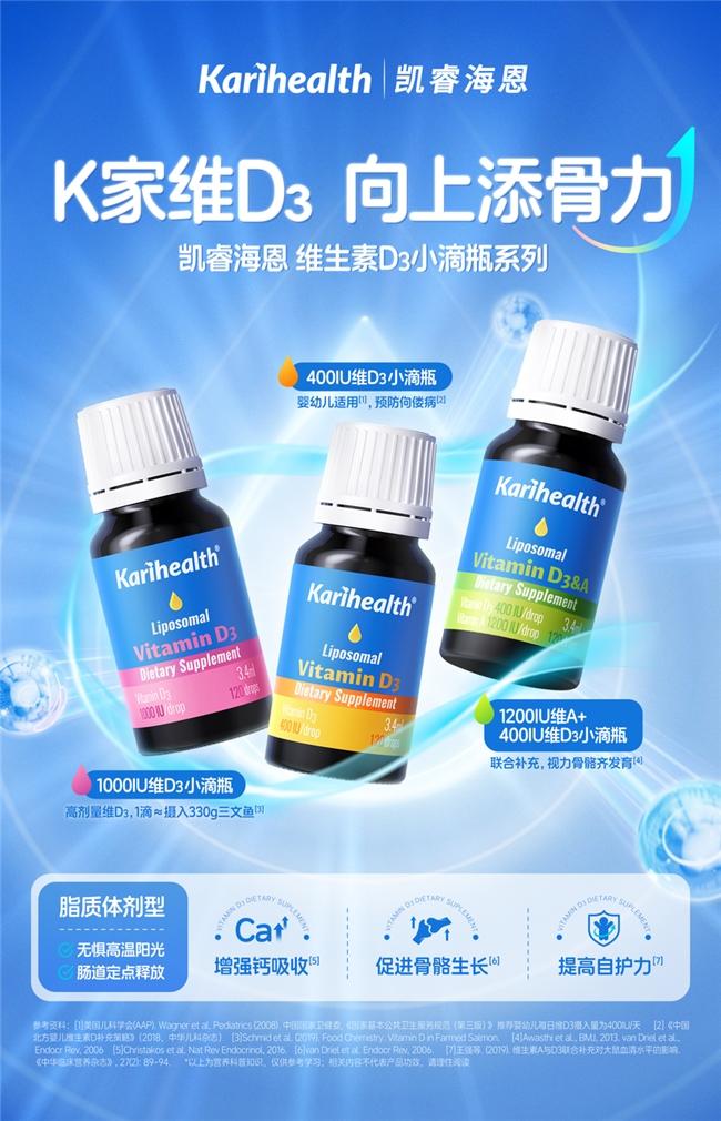 针对全人群差异化补维D需求,凯睿海恩的三款滴剂精准匹配不同人群生理需求:400IU基础款契合婴幼儿每日生理所需,且符合国家婴幼儿喂养指南,温和补充无负担;1000IU高剂量款则针对性地满足生长发育加速期的儿童青少年、老年人皮肤合成维D效率下降及孕产期女性额外的维D营养需求;400IU维D+1200IU维A复配款,直击儿童‘AD同补’核心需求,支持骨骼视力齐发育。